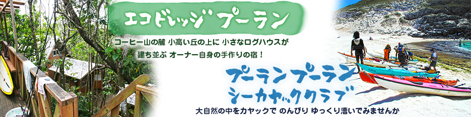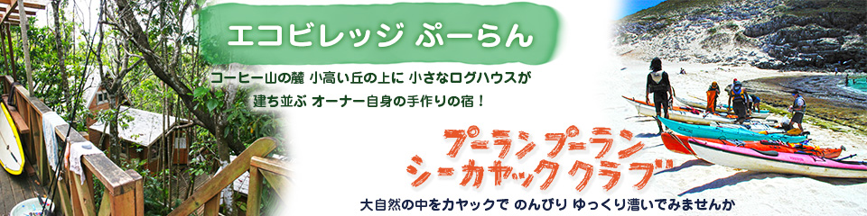 小笠原 父島 エコヴィレッジ ぷーらん / プーラン プーラン シーカヤッククラブのHP プーランってどんなところ? はじめての方は、まずこちらをチェック! シーカヤックツアー 小笠原の大自然をカヤックでのんびり、ゆっくり漕いでみませんか。 「エコヴィレッジぷーらん」 コーヒー山の麓 小高い丘の上に小さなログハウスが建ち並ぶ自然派宿 Chika Yoga ヨガクラス小笠原の大自然の中で、心と体を開放するゆったりヨガ